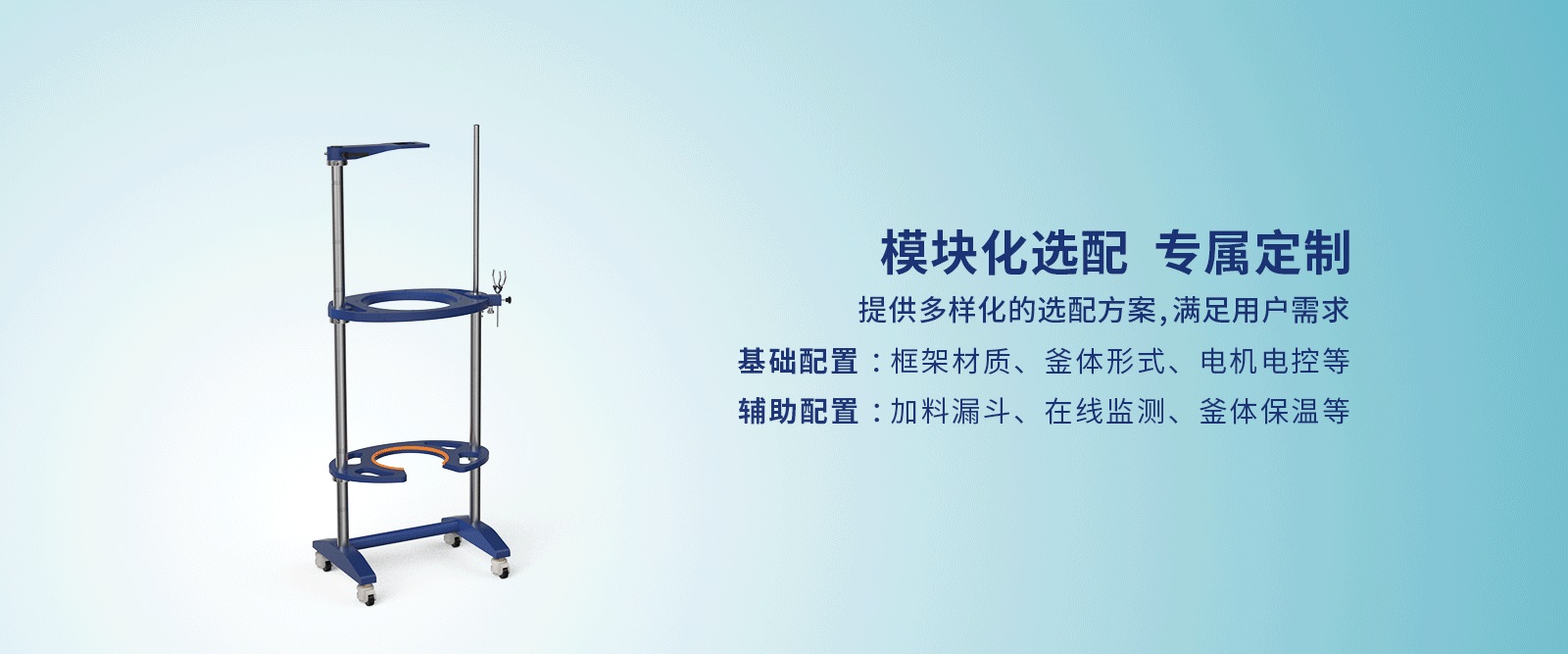 8、模塊化選配,提供多樣化的選配方案,滿足用戶需求。基礎(chǔ)配置:框架材質(zhì),釜體形式,電機電控等。輔助配置:加料漏斗,在線監(jiān)測,釜體保溫等。