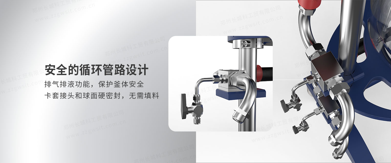 5、循環(huán)管路設(shè)計安全:排氣排液功能,保護釜體安全,卡套接頭和球面硬密封,無需填料;