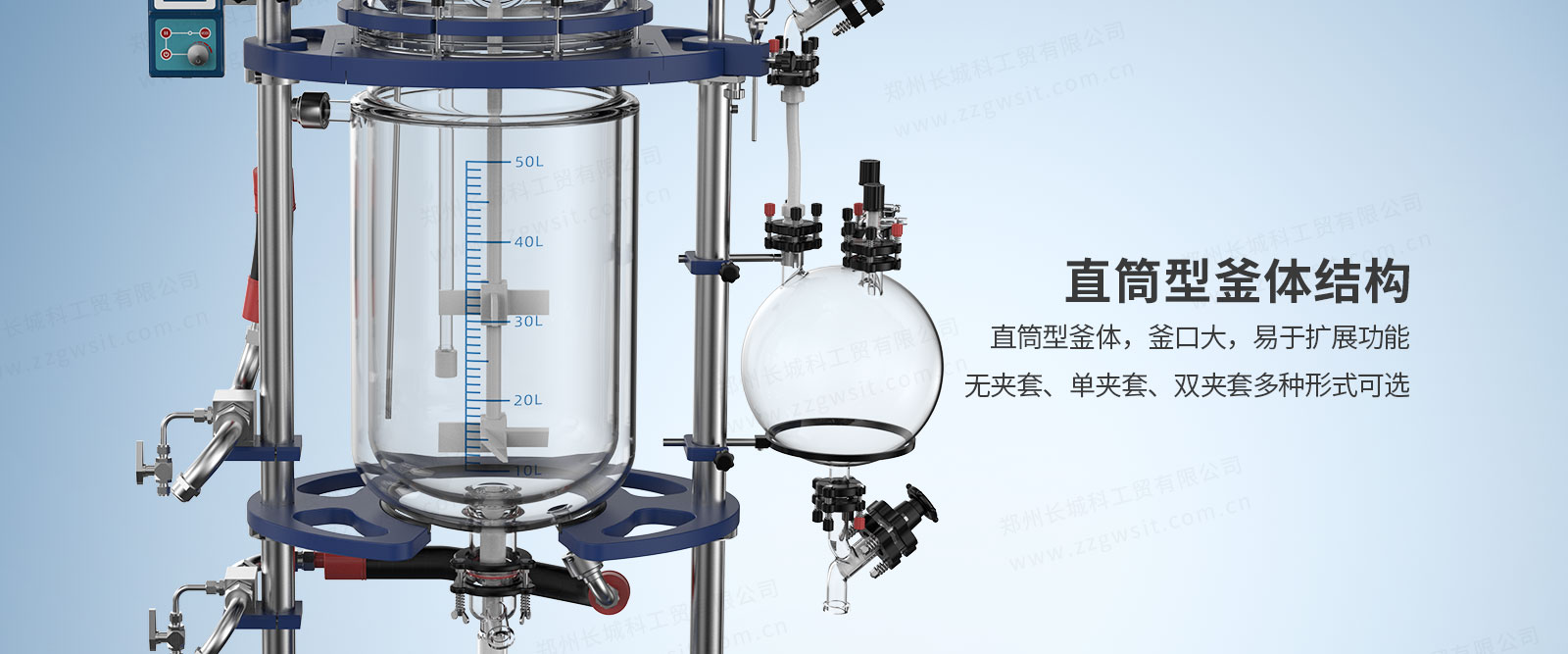 6、直筒型釜體結(jié)構(gòu):直筒型釜體,釜口大,擴展功能多,無夾套、單價套、雙夾套多種形式可選;
